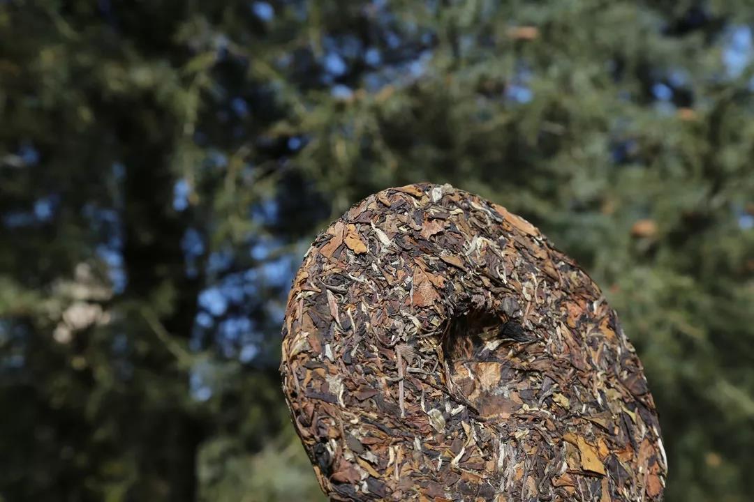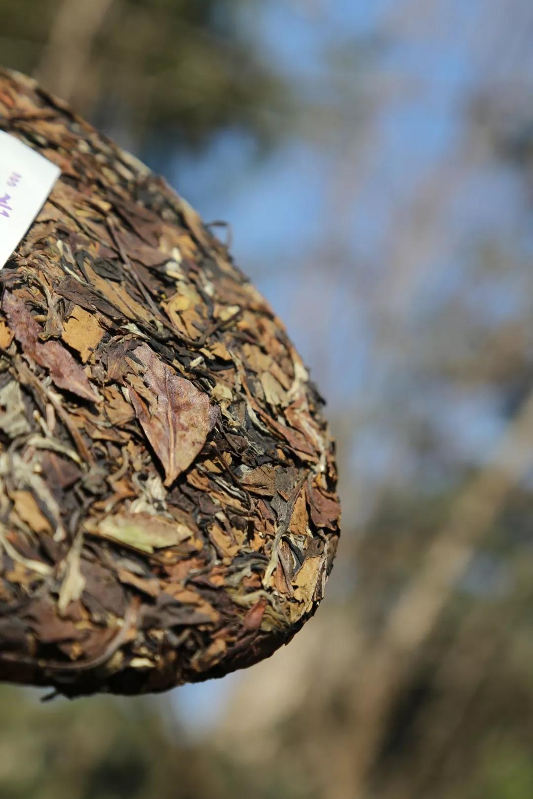 茶饼呈棕色,银白的毫心显露,绒毛熠熠生辉,茶叶肥而厚,干茶毫香明显,蓬松易撬。