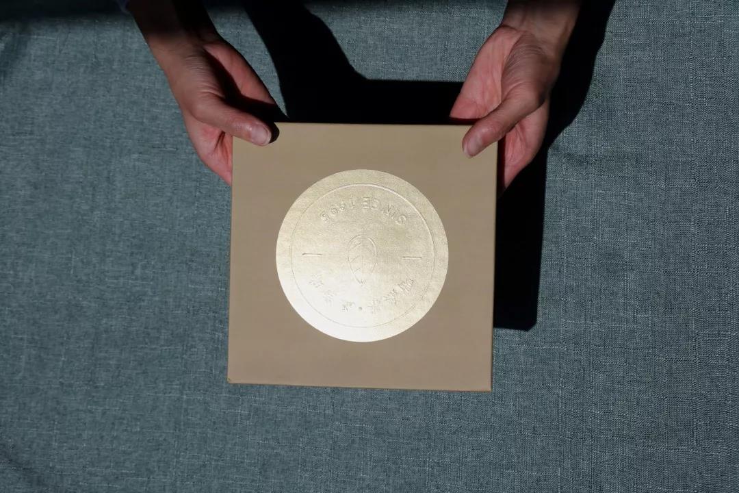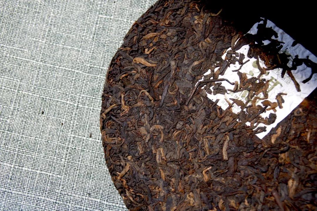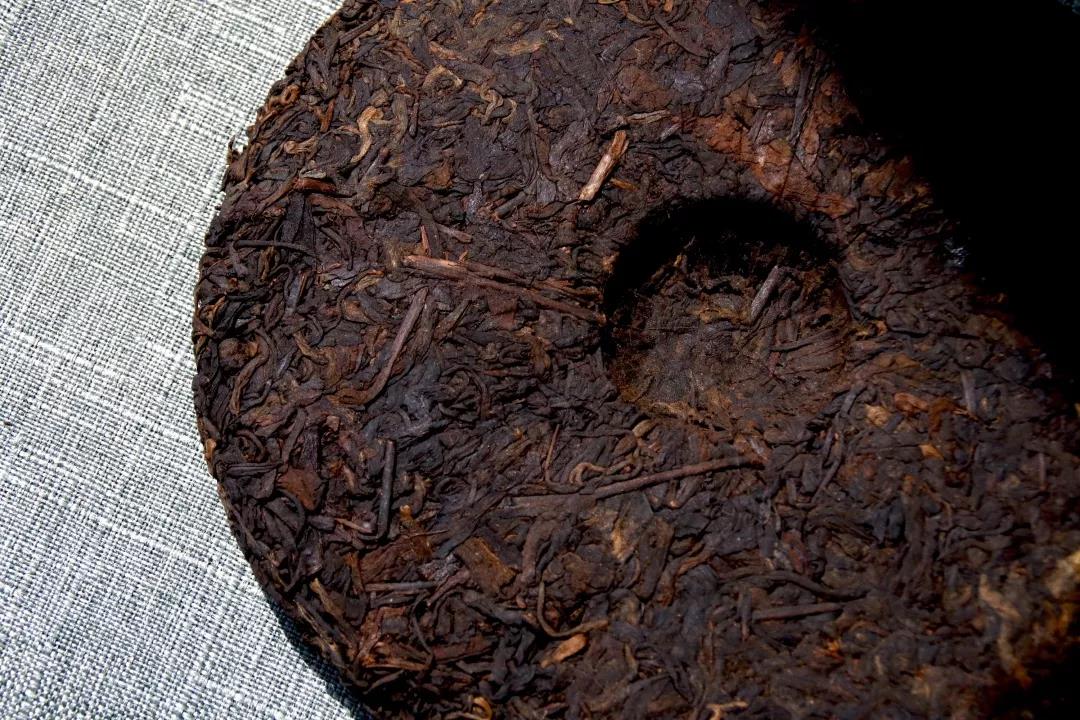 隔着棉纸就可闻到茶饼的陈香味,香气十分淡雅。拆开棉纸,茶饼为红褐色,可见叶梗较多,选料粗老,有粗犷的美感。